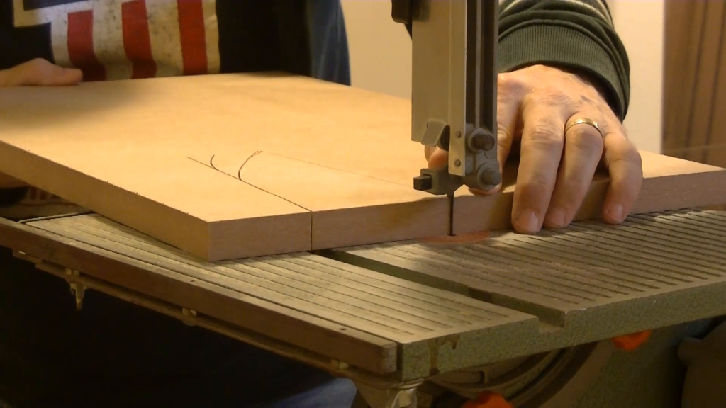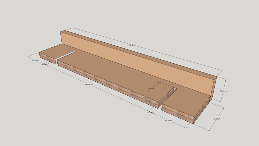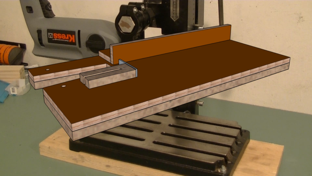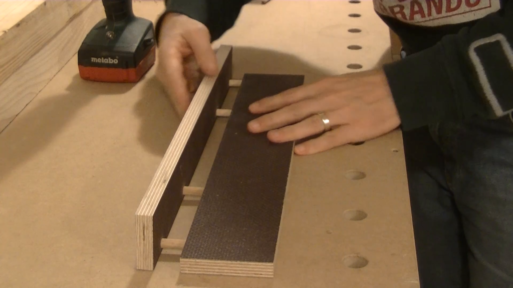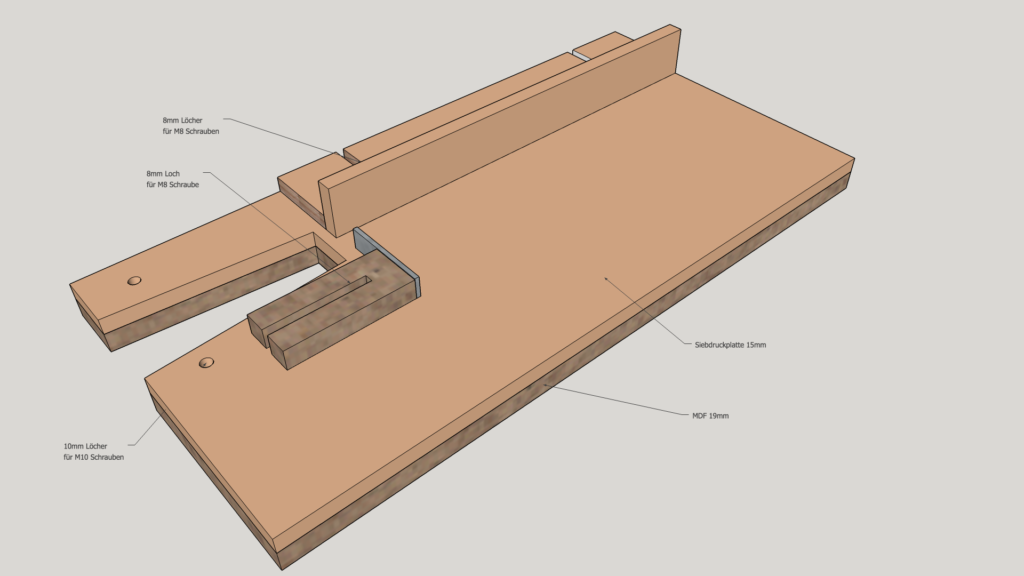 Jetzt kann der Längsanschlag gebaut werden. Dieser besteht aus einem Fuss und dem eigentlichen Anschlag. Da sich Siebdruckplatten schlecht verleimen lassen verbinde ich sie mit Holzdübeln. Dabei ist sehr wichtig, dass die beiden Teile exakt rechtwinklig miteinander verleimt werden. Vor dem Verleimen müssen aber noch die Querschlitze gesägt werden.