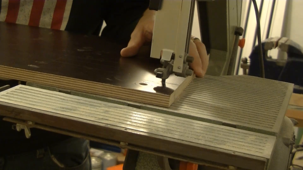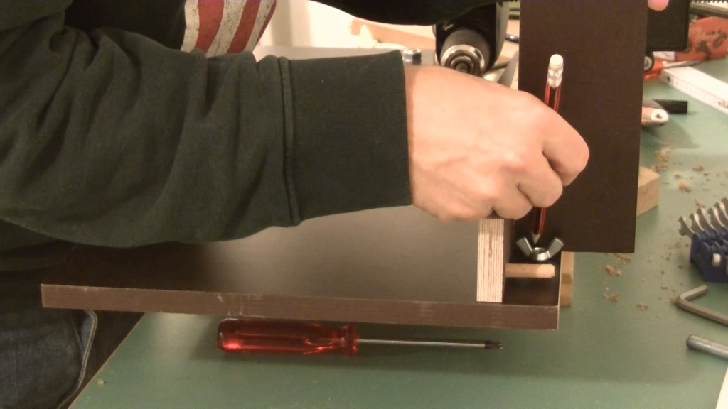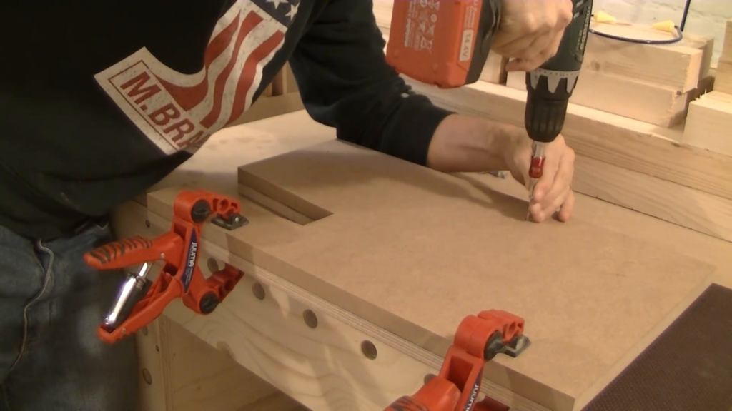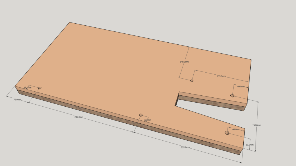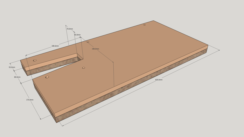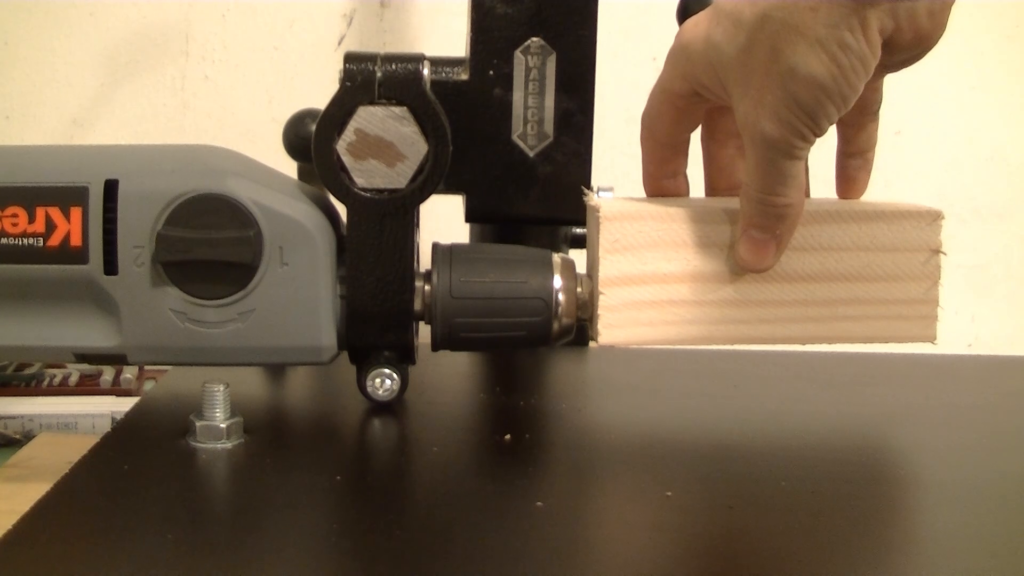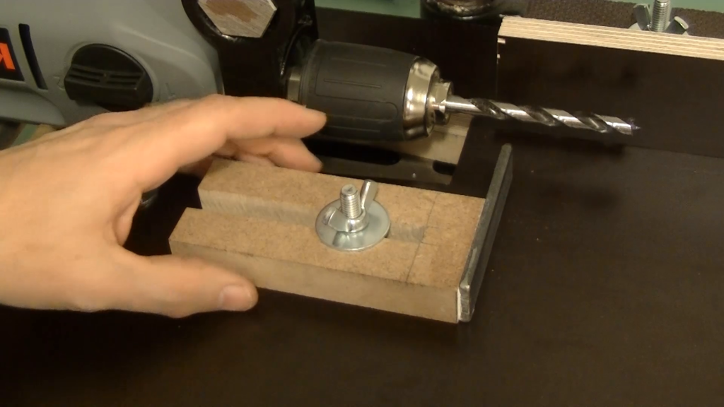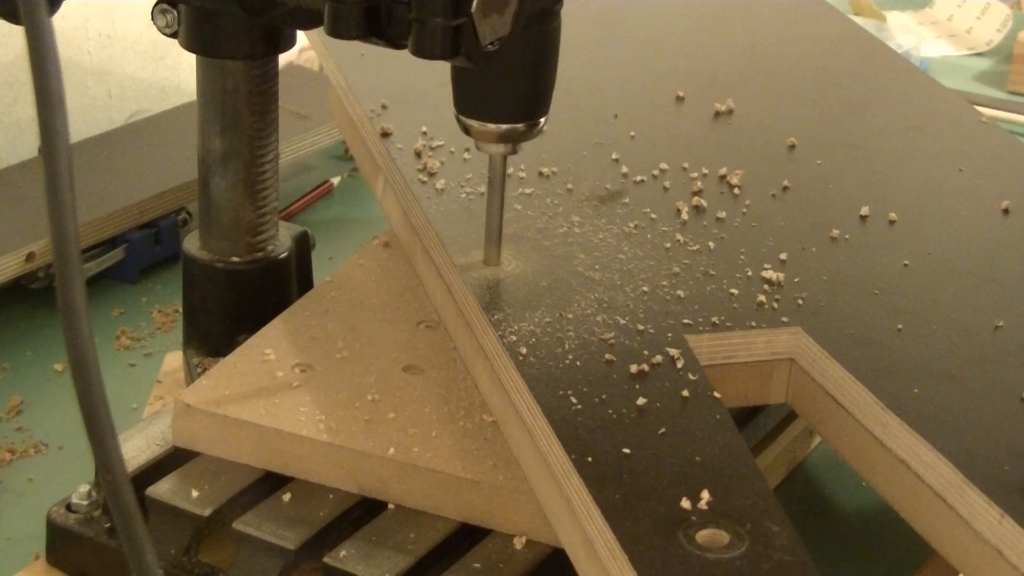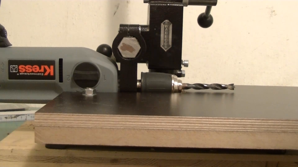 Damit die Bohrmaschine weit genug abgesenkt werden kann, muss in die Siebdruckplatte noch ein Ausschnitt für den Bohrer gesägt werden. Da das nicht genügt wird die Siebdruckplatte noch mit einer 19 mm MDF Platte unterlegt. Damit kann der Bohrer fast bis auf die Oberfläche des Bohrtisches abgesenkt werden.