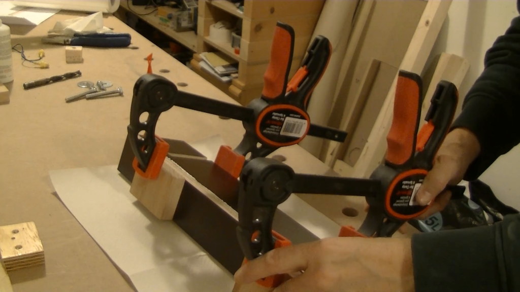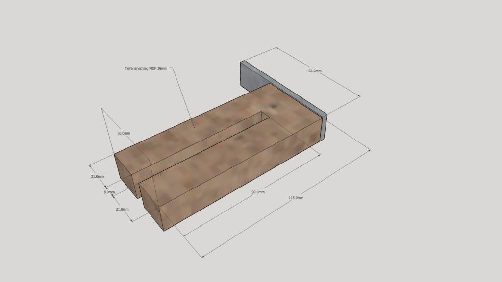 Aus eine Reststück MDF und einem Stück Stahl wird noch ein Tiefenstopp hergestelt. Die Stahlschiene wird mit Montagekleber auf dem MDF verleimt.