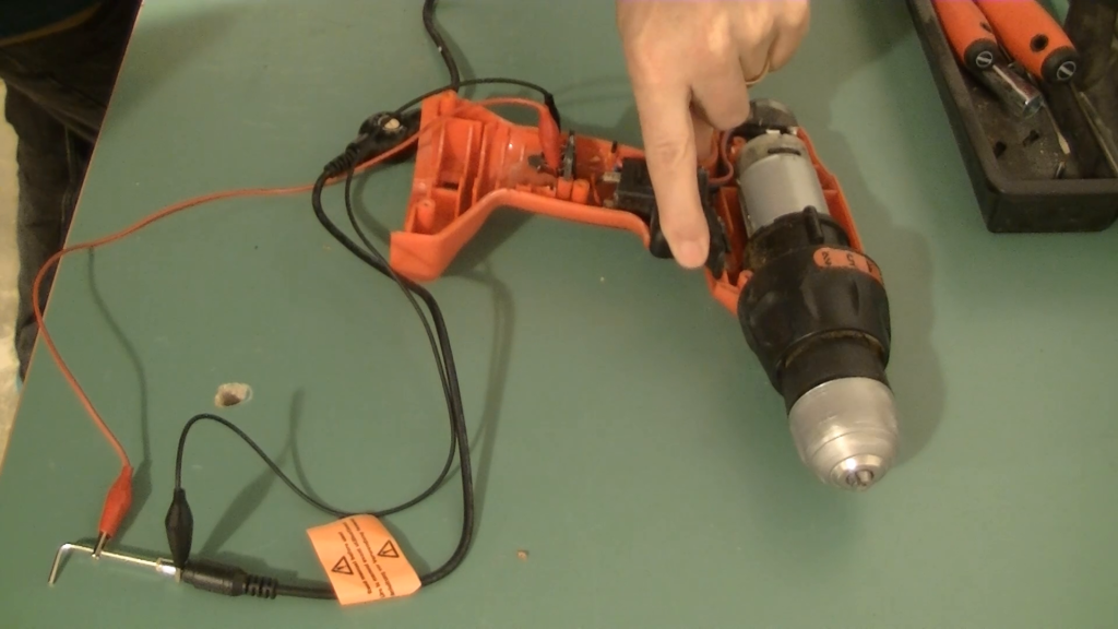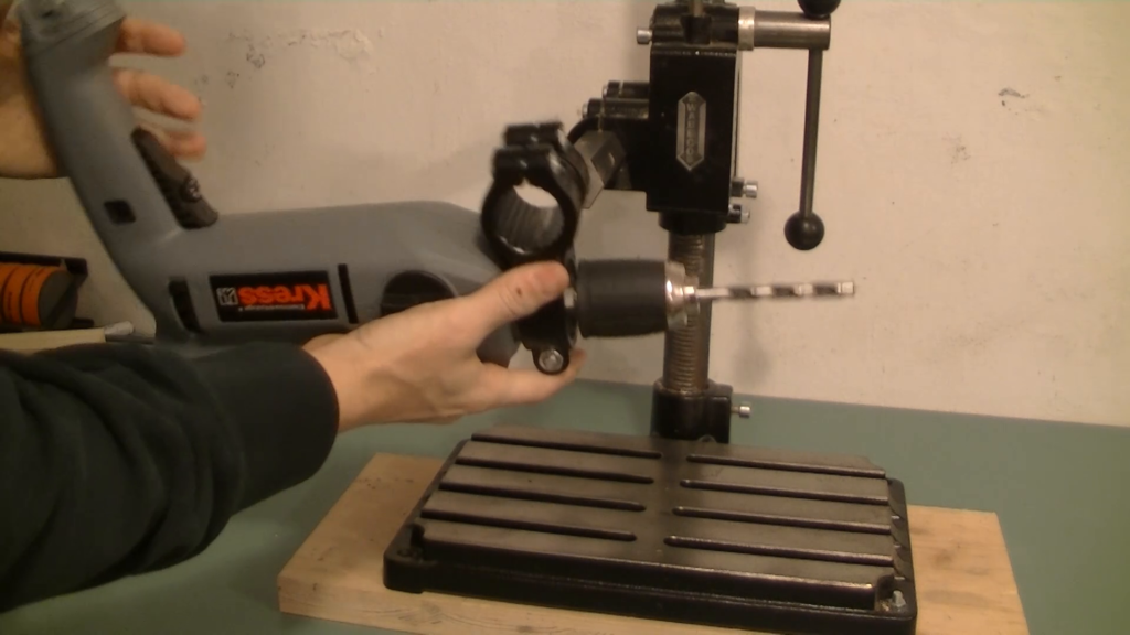 Mein erster Versuch basierte auf einem alten Akkuschrauber. Mit einem 12V Netzteil haben wir ihn wieder belebt. Eine spezielle Halterung hätte den Bohrkopf horizontal und vertikal verschiebbar gemacht. Hätte – leider reicht die Leistung eines 12V Schraubers bei weitem nicht um 8 oder 10 mm Löcher zu Bohren.