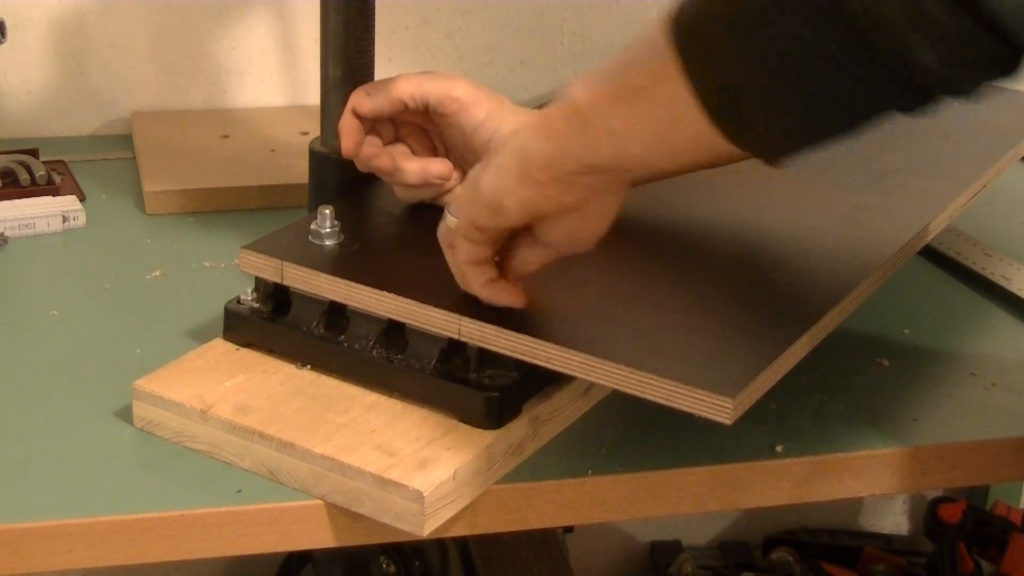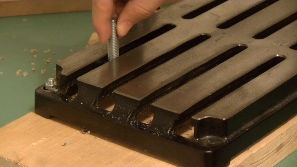Als erstes muss die Siebdruckplatte fest mit dem Bohrtisch verbunden werden können. Dafür gibt es spezielle T-Nut Steine. Wesentlich günstiger und genau so stabil geht es mit M10 Muttern.